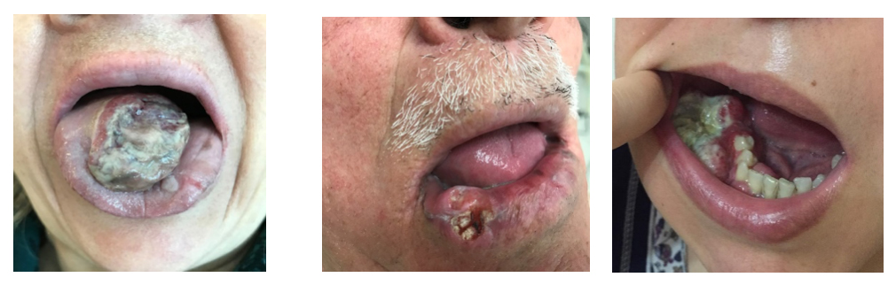 Чаще всего возникют симптомы: Незаживающая кровоточащая рана на губе, десне или слизистой оболочке полости рта, Уплотнение или вздутие с внутренней стороны щеки, ощутимое языком, Потеря чувствительности или онемение в любой части полости рта, Белые (лейкоплакия) или красные (эритроплакия)пятна на губах, языке или слизистой оболочке полости рта, Трудности при пережевывании или глотании пищи, Болевые ощущения или беспричинная боль в полости рта; чувство, что-то застряло в горле без видимой причины, Отек челюсти со смещением протезов (шатания зубов), Боль в ушах, и отек в области шеи (в случаи если есть распространение на шеи лимфатических узлов), Подобно таких жалоб и симптомов, пациент обязательно должен обратиться к ЛОР-врачу.